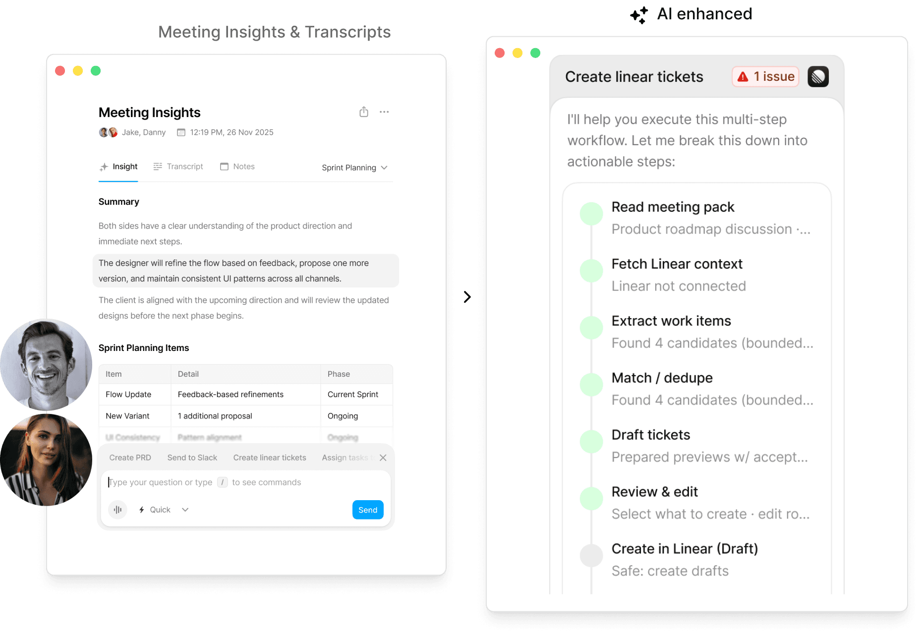 Tastefully turns client and product meetings into tickets, follow-ups, and decision logs — without a meeting bot.